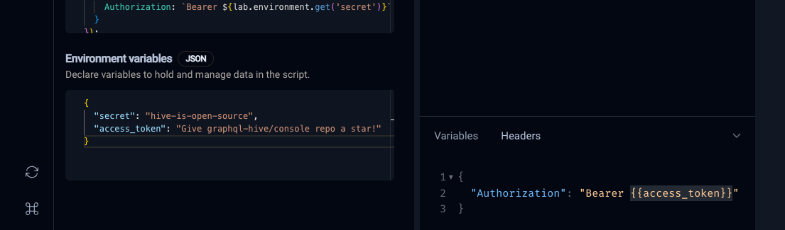 To use environment variables in the HTTP headers of your GraphQL requests, wrap the keys in double curly braces, for example: